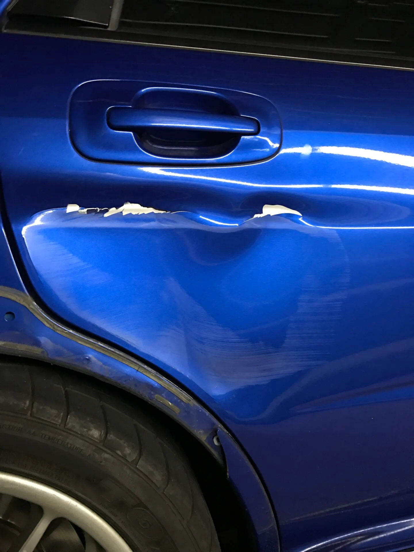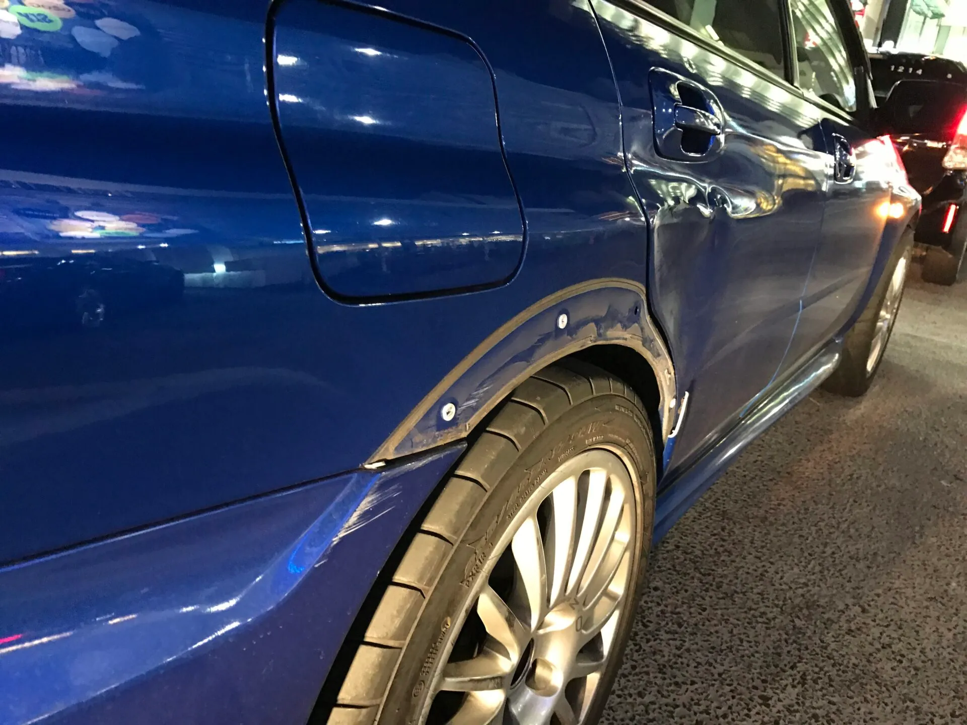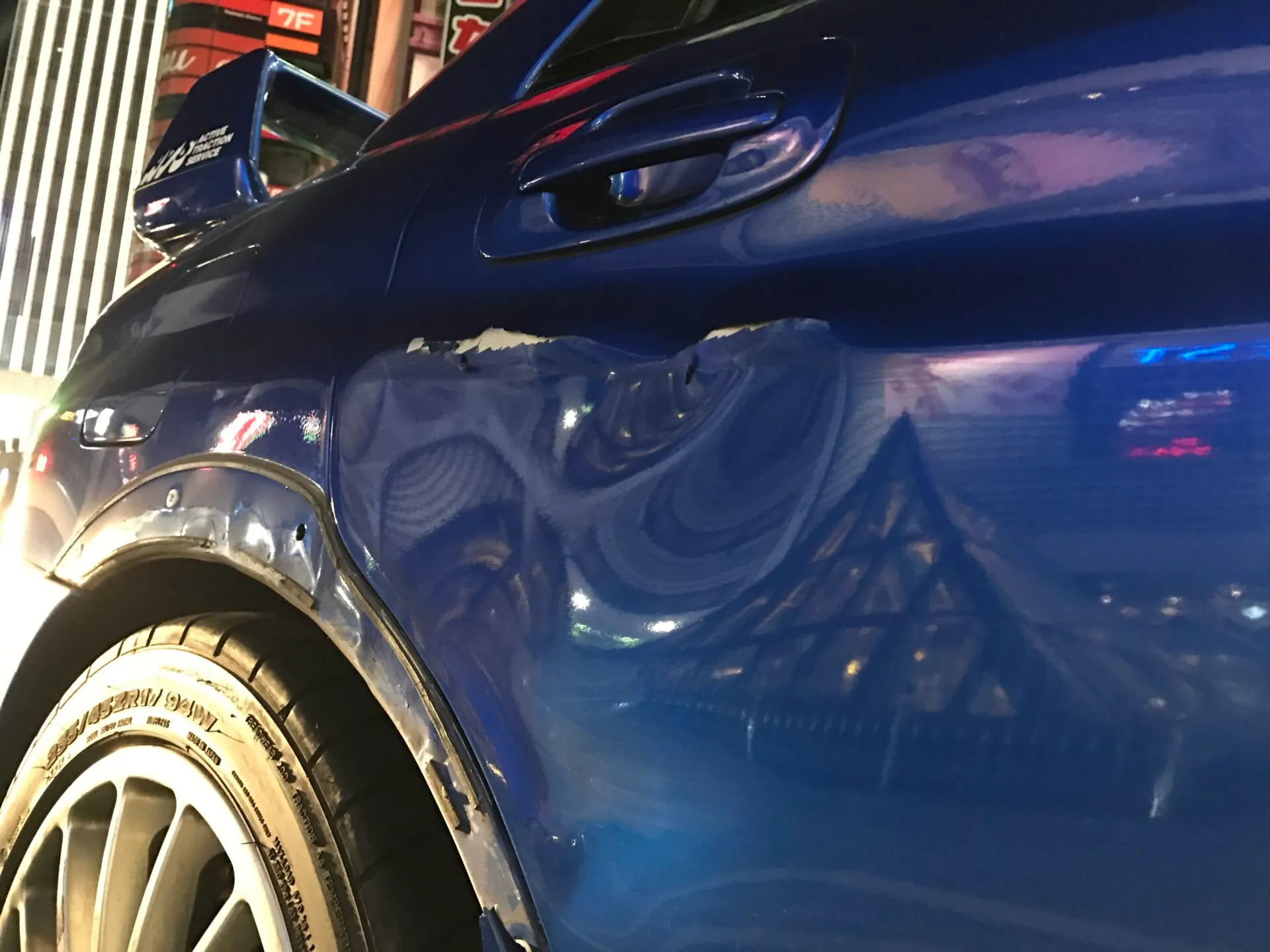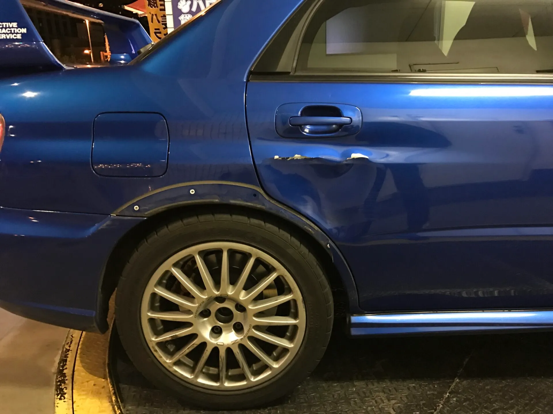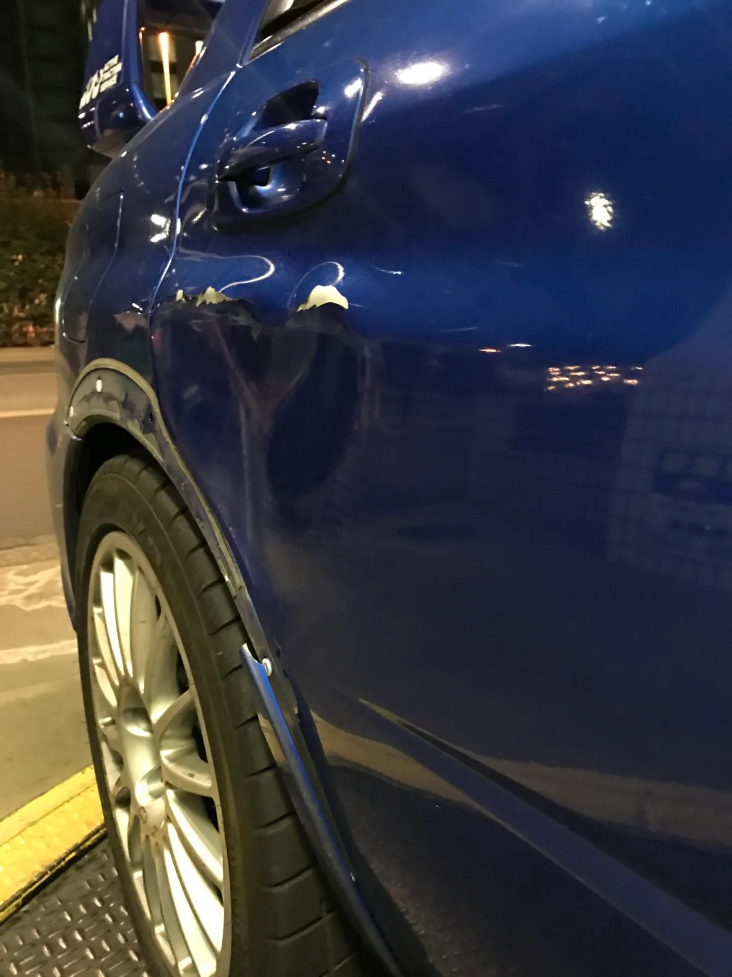 悲しい。ドアが凹んでフェンダーが壊れて、ホイールが傷だらけ。