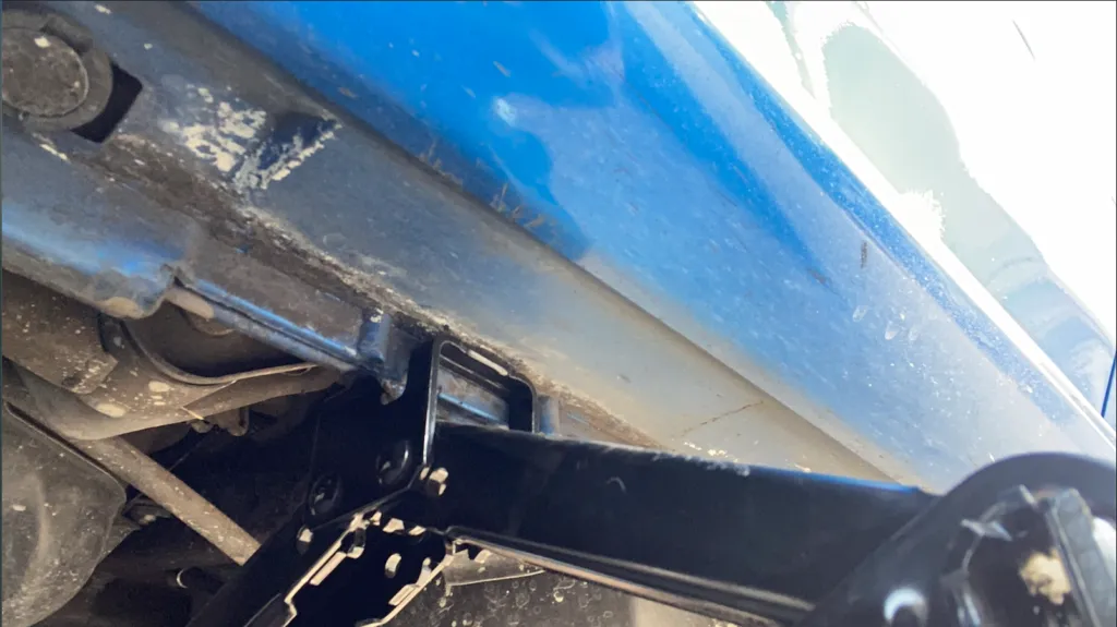 1つは、フロントタイヤの少し後ろ。もう1つはリアタイヤの少し前。下の写真のように、パンタジャッキが当たるように立てに切れ込みが入っているところがジャッキポイントです。